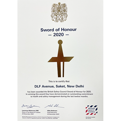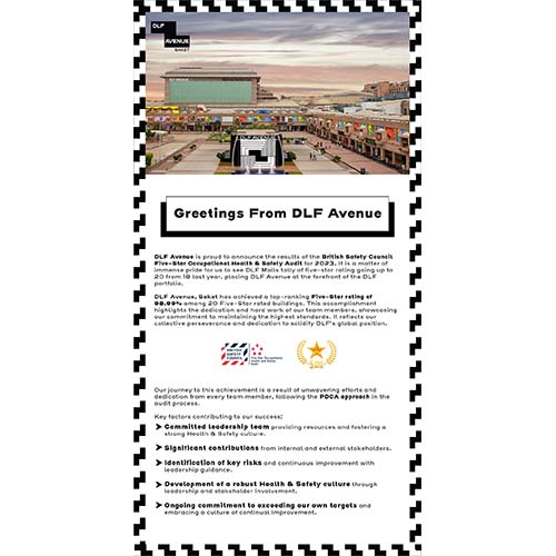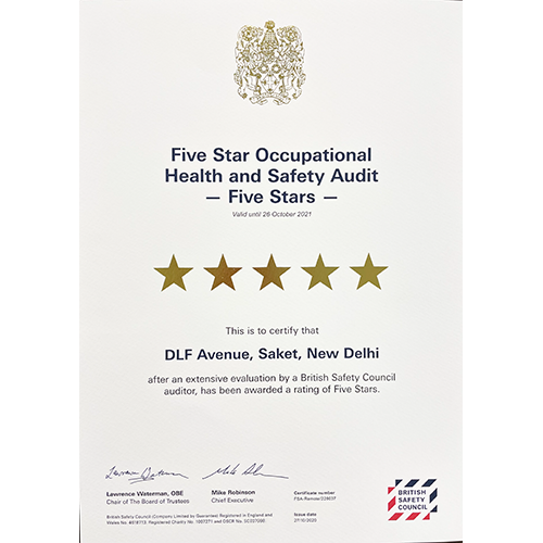 DLF Avenue Saket, has been awarded Five-Star Rating in Occupational Health and Safety by British Safety Council 2023